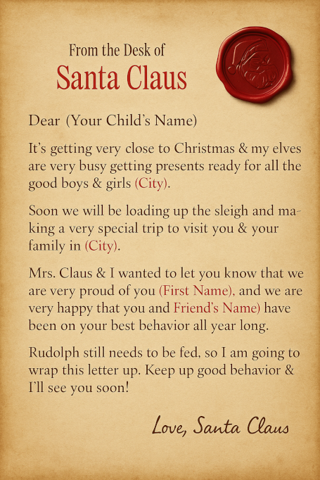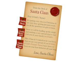 Quickly create your child’s Santa letter. It only takes a minute. Each child receives a special letter made just for them.